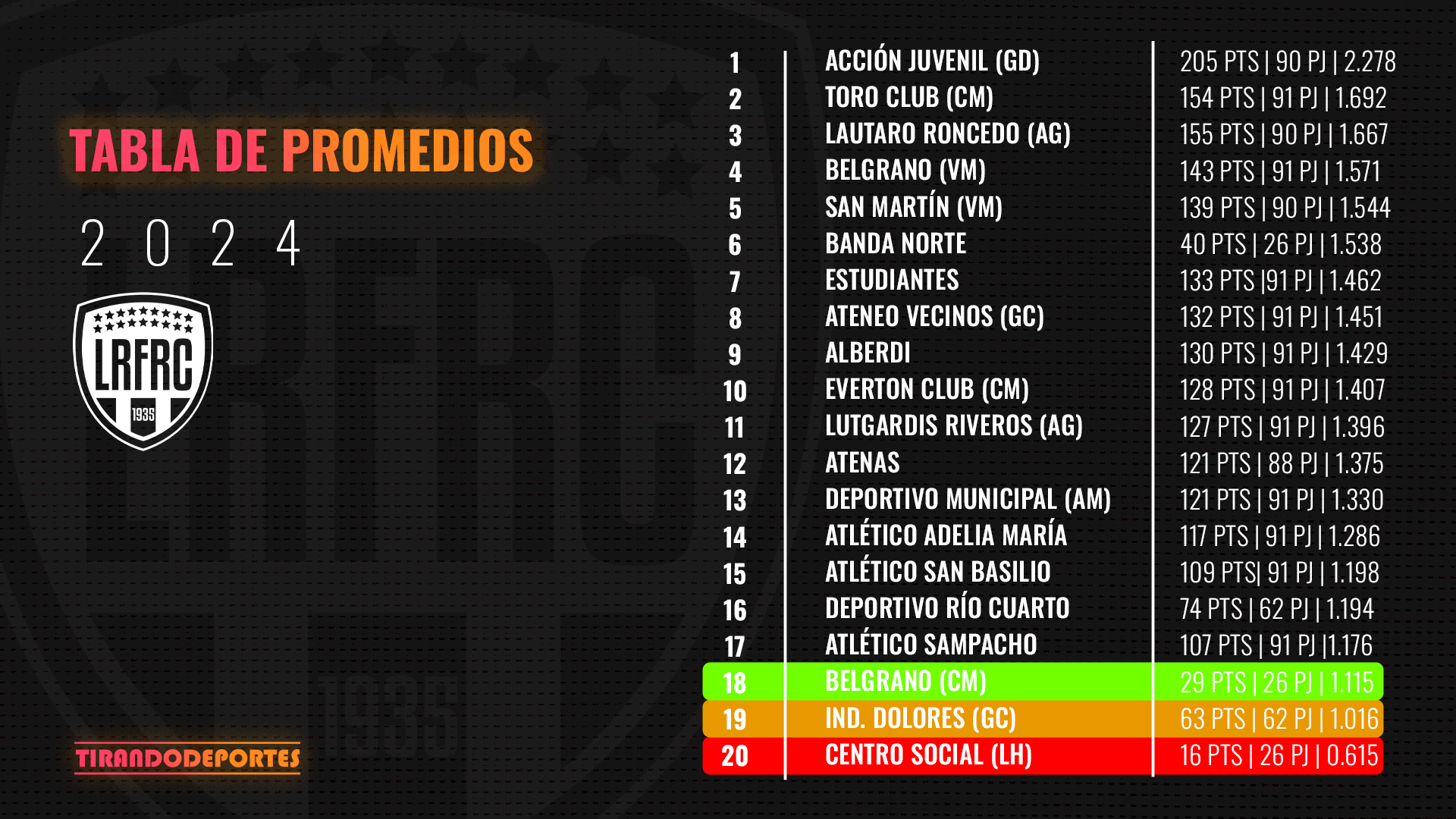 Si nos fijamos en los promedios, hasta el momento, Centro Social estaría dejando la categoría. Los dirigidos por Cristián Giménez no están teniendo el mejor año, en su regreso a la «A» y deben empezar a sumar de a tres para poder dar pelea y empatar con Dolores de General Cabrera.