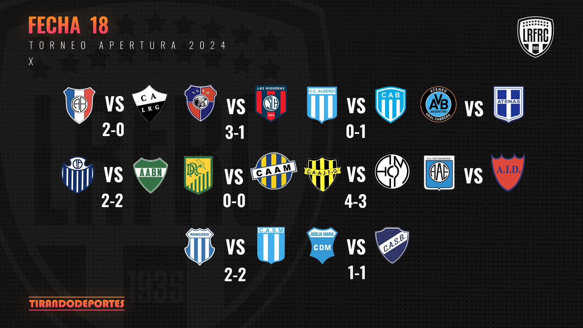 En Moldes, Toro también ganó pero no alcanzó. Goleó 3-1 a Centro Social y cierra una campaña muy buena de la mano de Jorge Zalazar. Por otro lado, en Sampacho, Atlético empató 2-2 con un Banda Norte que se le hizo muy complicado sumar lejos de casa. En Gigena, también se repitió el resultado. Roncedo emató 2-2 contra San Martín y desaprovechó la oportunidad de pelear por el tercer lugar. Caso similar al de Lutgardis Riveros, que perdió 2-0 frente a Belgrano de Mackenna.