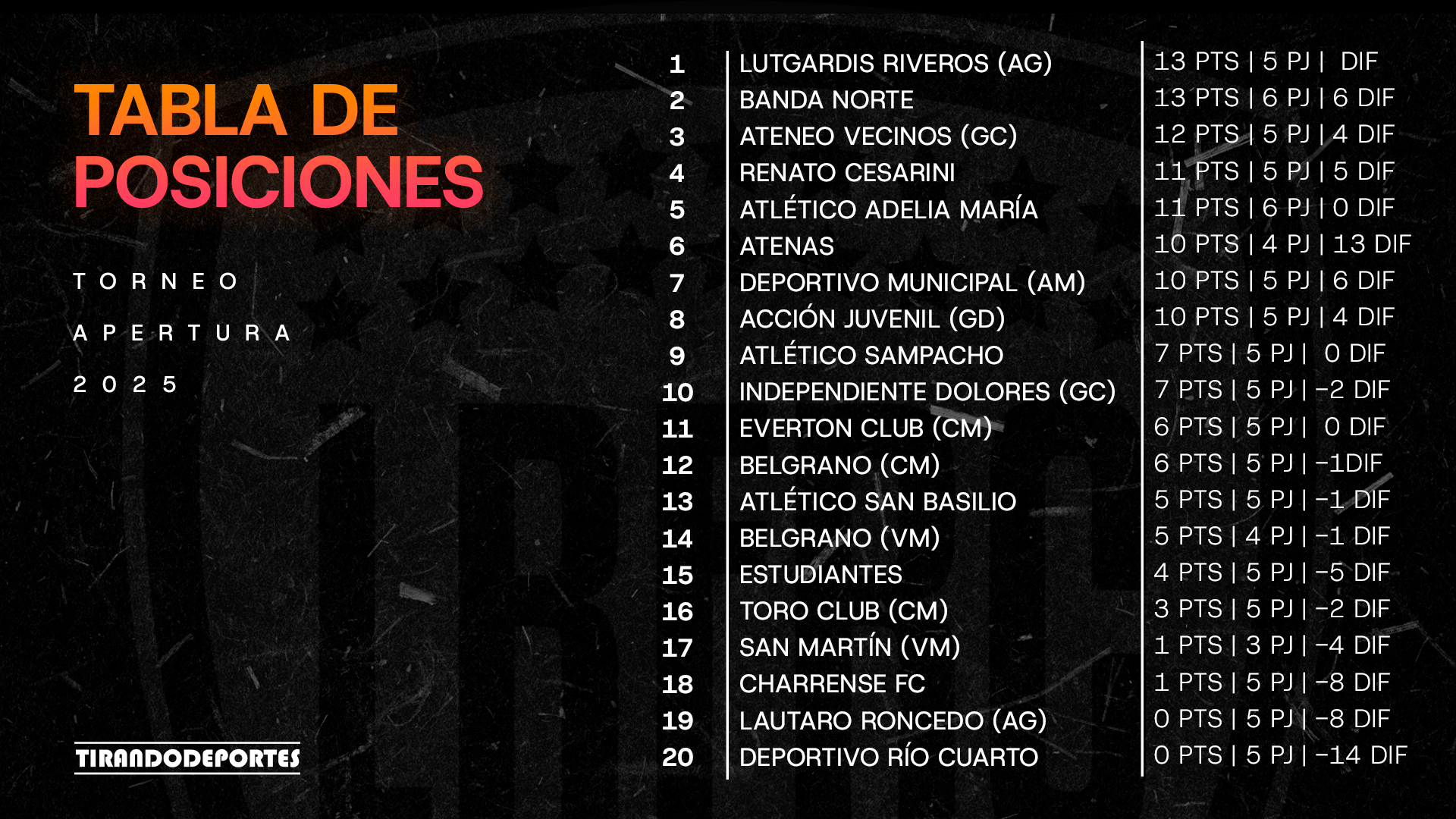 Sin embargo, quienes si sumaron y se empiezan a prender fueron los dirigidos de Seimandi. Banda Norte venció 2-1 a Toro en cancha de Deportivo y es el nuevo escolta del «Inglés». La otra victoria se dio en Sampacho, donde Atlético le ganó 2-1 a Charrense FC.