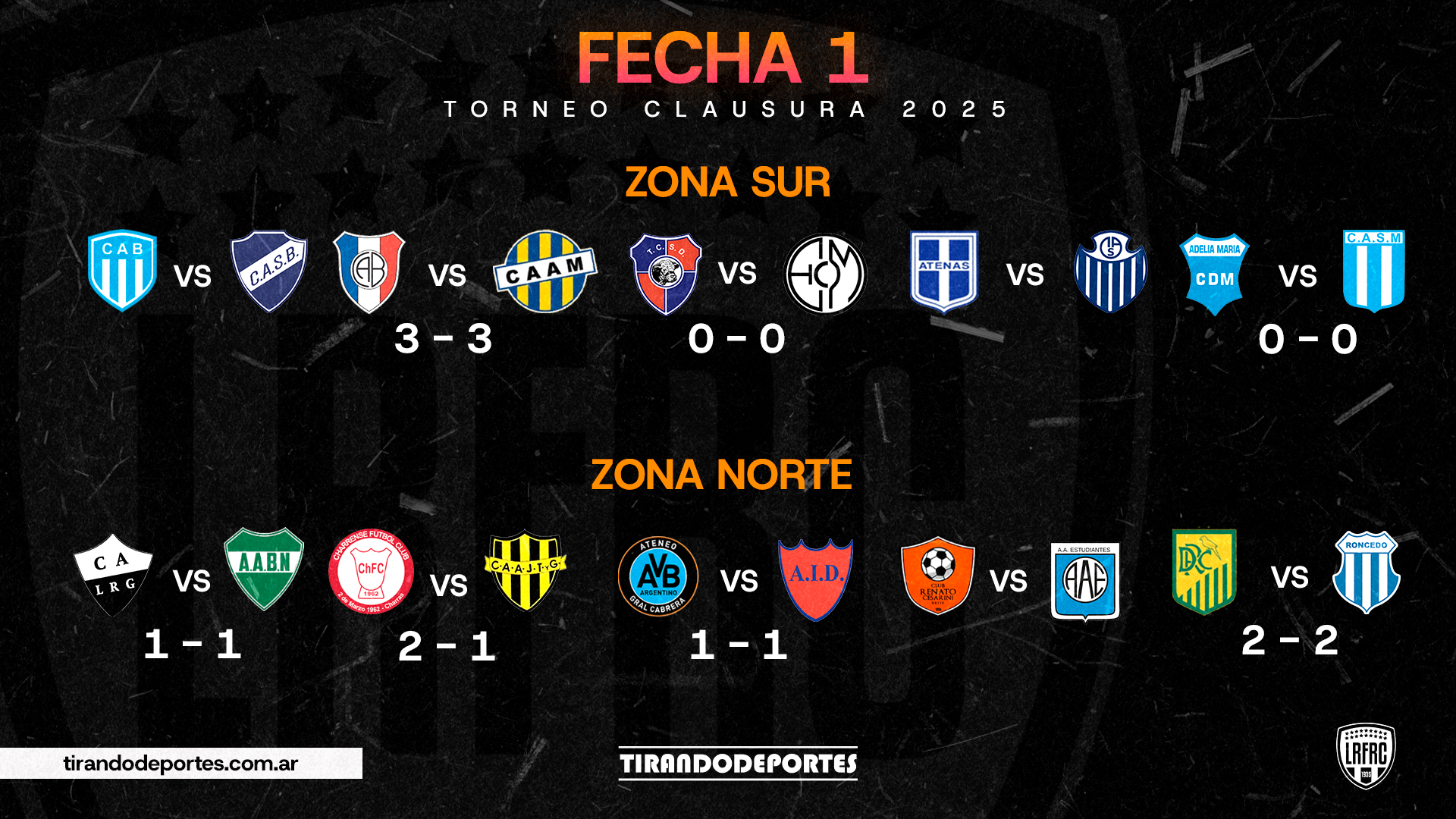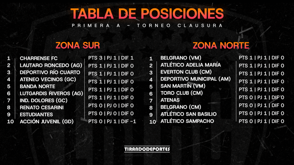 Charrense fue el único equipo que logró una victoria en el arranque. Lo hizo como local ante Acción Juvenil, en un partido cerrado que terminó 2-1. Deportivo Río Cuarto y Lautaro Roncedo empataron 2 a 2 en Río Cuarto, con varias polémicas arbitrales de por medio.