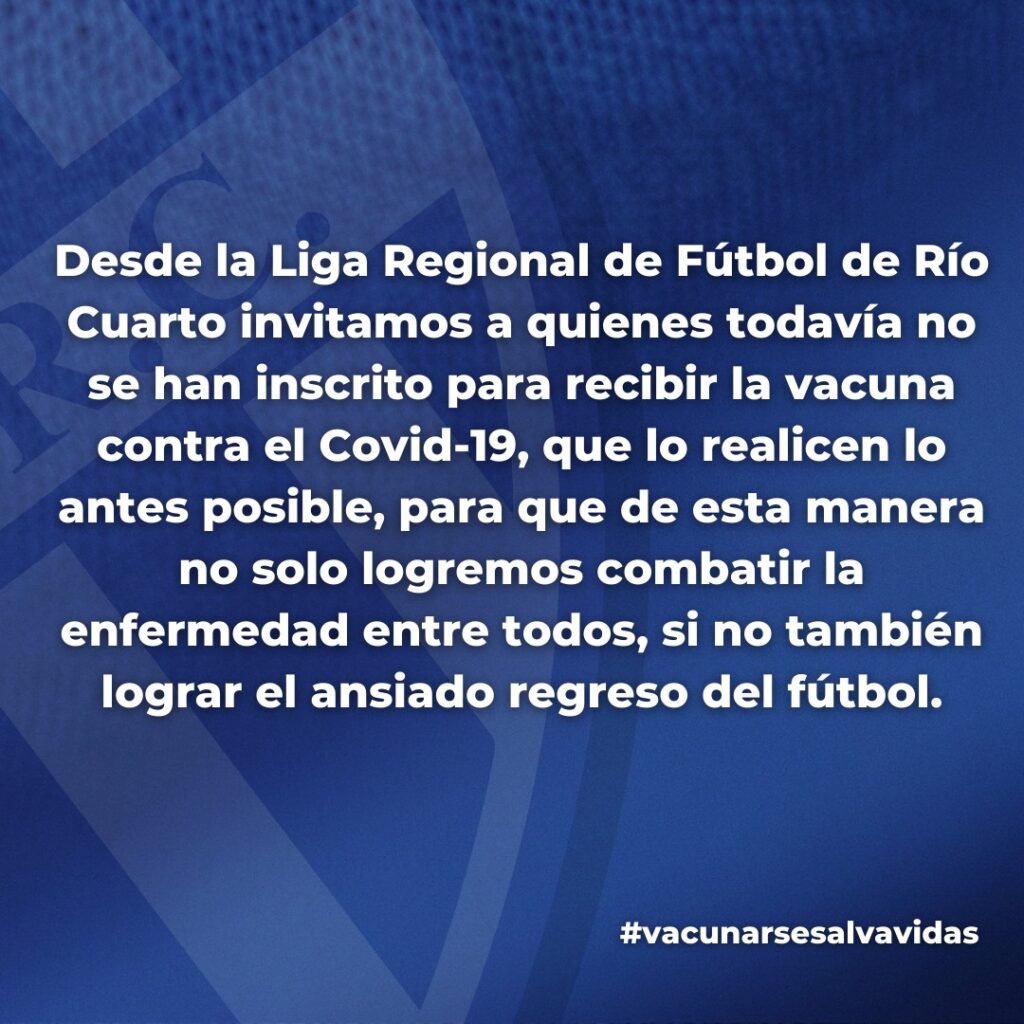 Por eso mismo, desde la Liga Regional Rio Cuarto buscaron apoyar el plan del gobierno y pide a la sociedad la vacunación inmediata no solo por el bien del colectivo sino también para la vuelta con publico a las canchas.