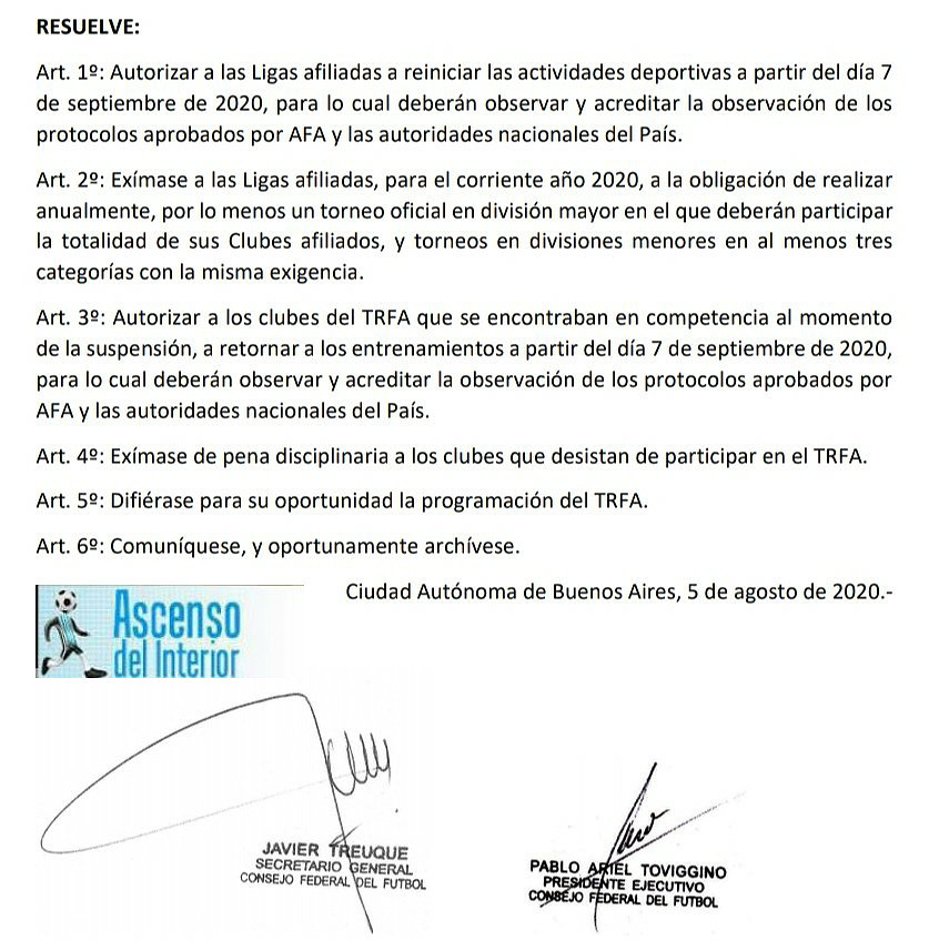 Desde el ente máximo que rige el fútbol del interior, se ha enviado la resolución oficial sobre la posibilidad que tendrán aquellos clubes que pueden participar del Torneo Regional a disputarse en los últimos meses del año y los clubes de todas las ligas de volver a los entrenamientos a partir del 7 de Septiembre.