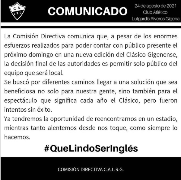 En el comunicado, Riveros hizo saber que «Fueron intentos sin éxito» el proceso de permitir ambas hinchadas y por lo tanto habrá solamente gente del «Ingles».