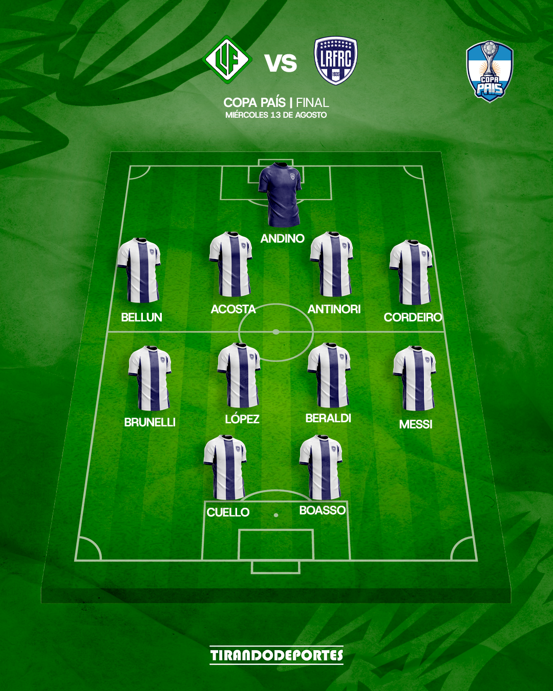 Los posibles 11 titulares: Andino; Bellú, Acosta, Antinori, Cordeiro; Brunelli, López, Beraldi, Messi; Cuello y Boasso.