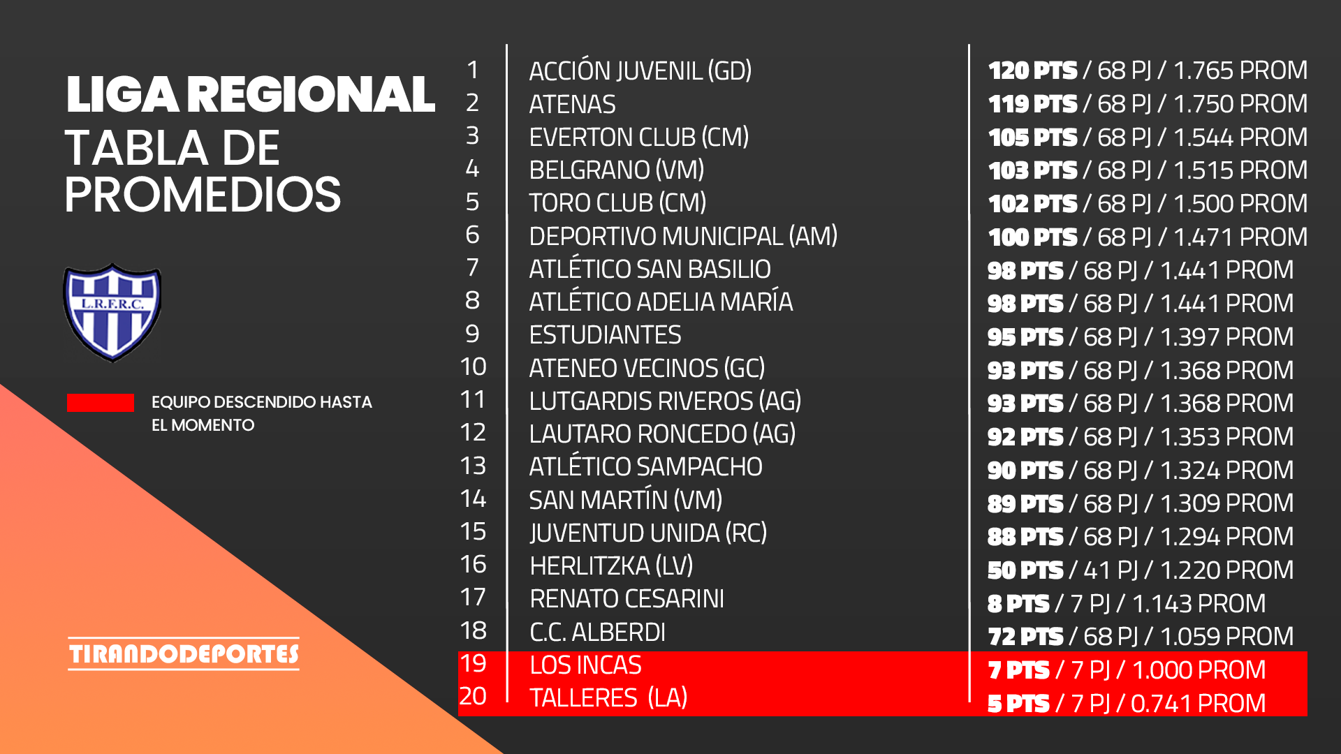 Esos recién ascendidos son Talleres de Acequias, Renato Cesarini y Los Incas. Tres equipos que cuentan con la ventaja de no tener que dividir sus puntos con tanta cantidad de partidos jugados, por lo que una campaña de mitad de tabla logrando sumar buenas unidades ya los salvaría del problema.