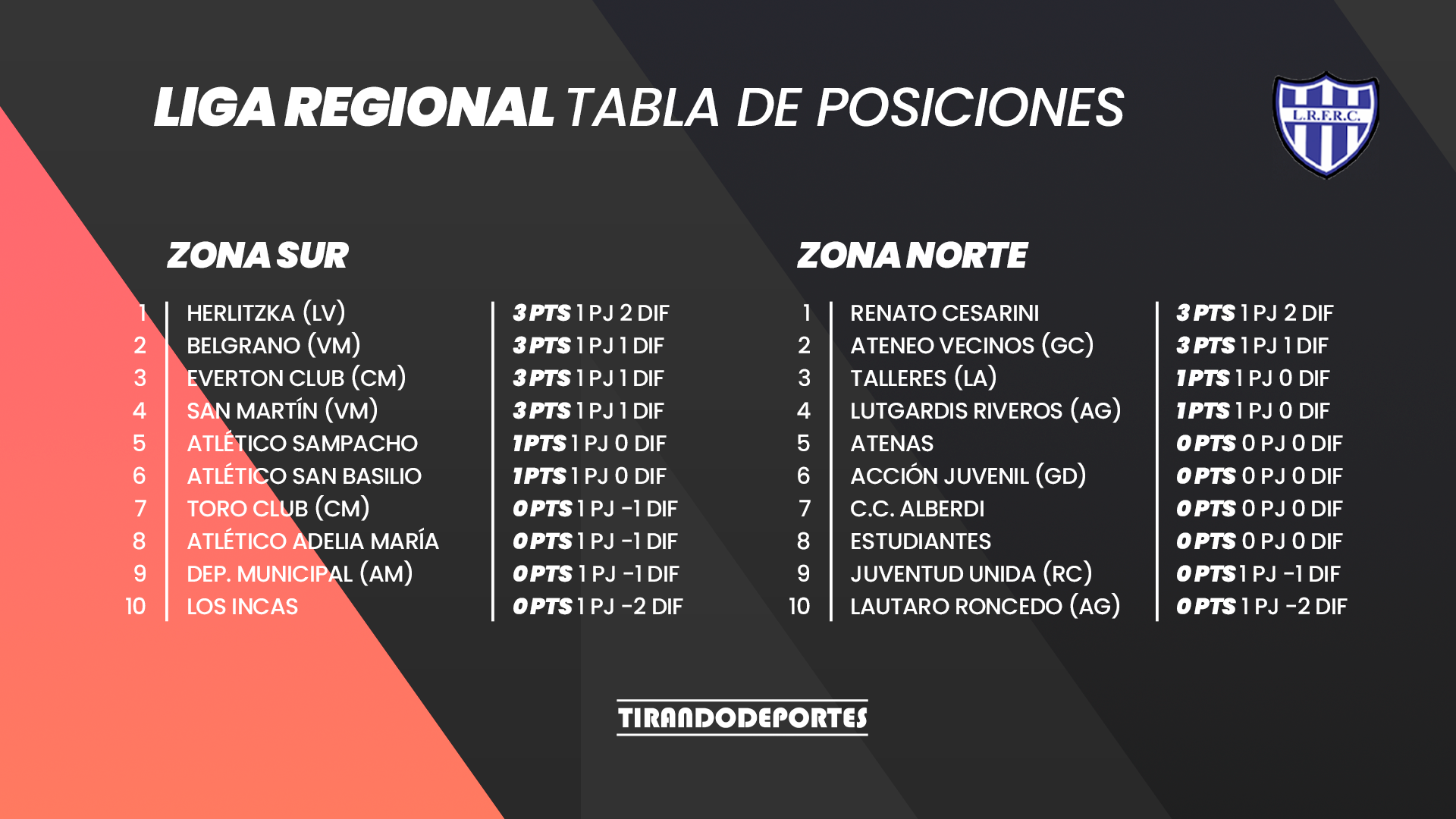 Si bien aún cuatro equipos de la zona norte deben jugar sus partidos para estar a la par del resto (Acción Juvenil-Alberdi y Estudiantes-Atenas), la fecha ya ha puesto primera.
