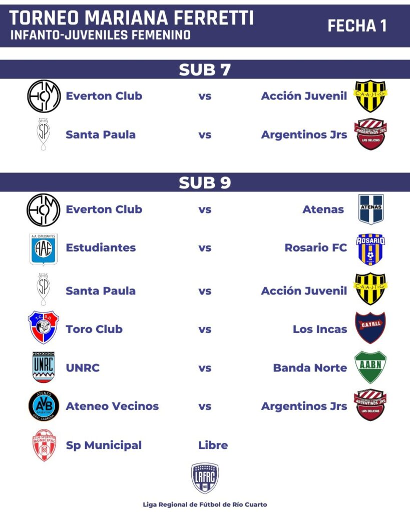 Atenas, Renato Cesarini, Rosario Fútbol Club, Santa Paula, Toro Club, Universidad Nacional de Río Cuarto, Ateneo Vecinos, Acción Juvenil, Sportivo Municipal, Estudiantes de Río Cuarto, Los Incas, Banda Norte, Argentinos Juniors de Las Delicias, Centro Social Las Higueras y El Ciclón participarán de la temporada 2023 que tendrá un torneo bajo la denominación de “Mariana Ferretti” referente del futbol femenino regional.