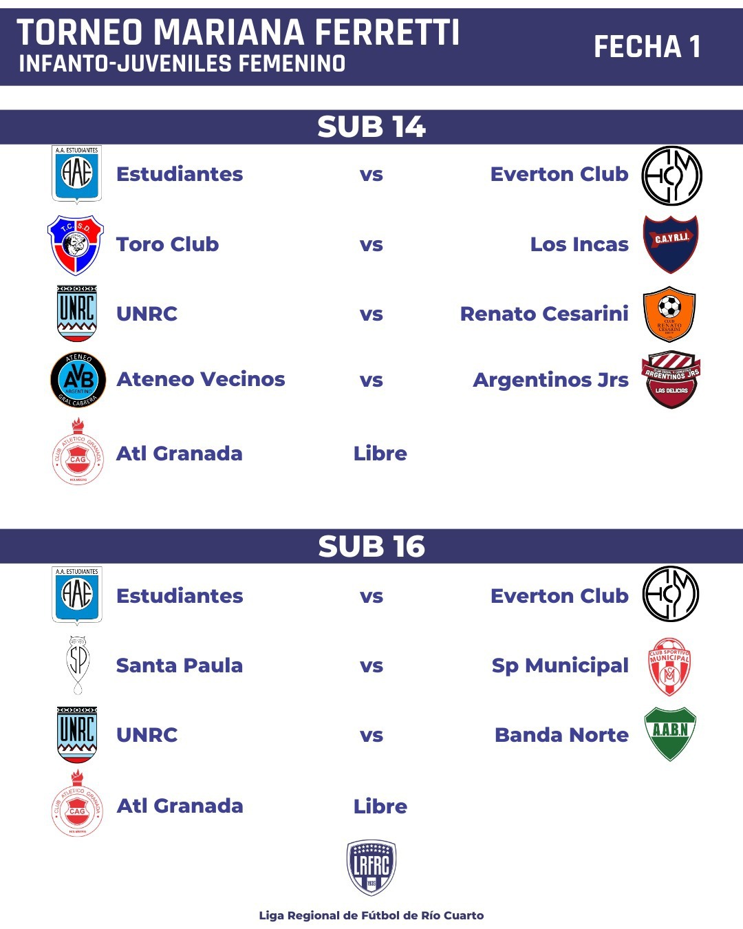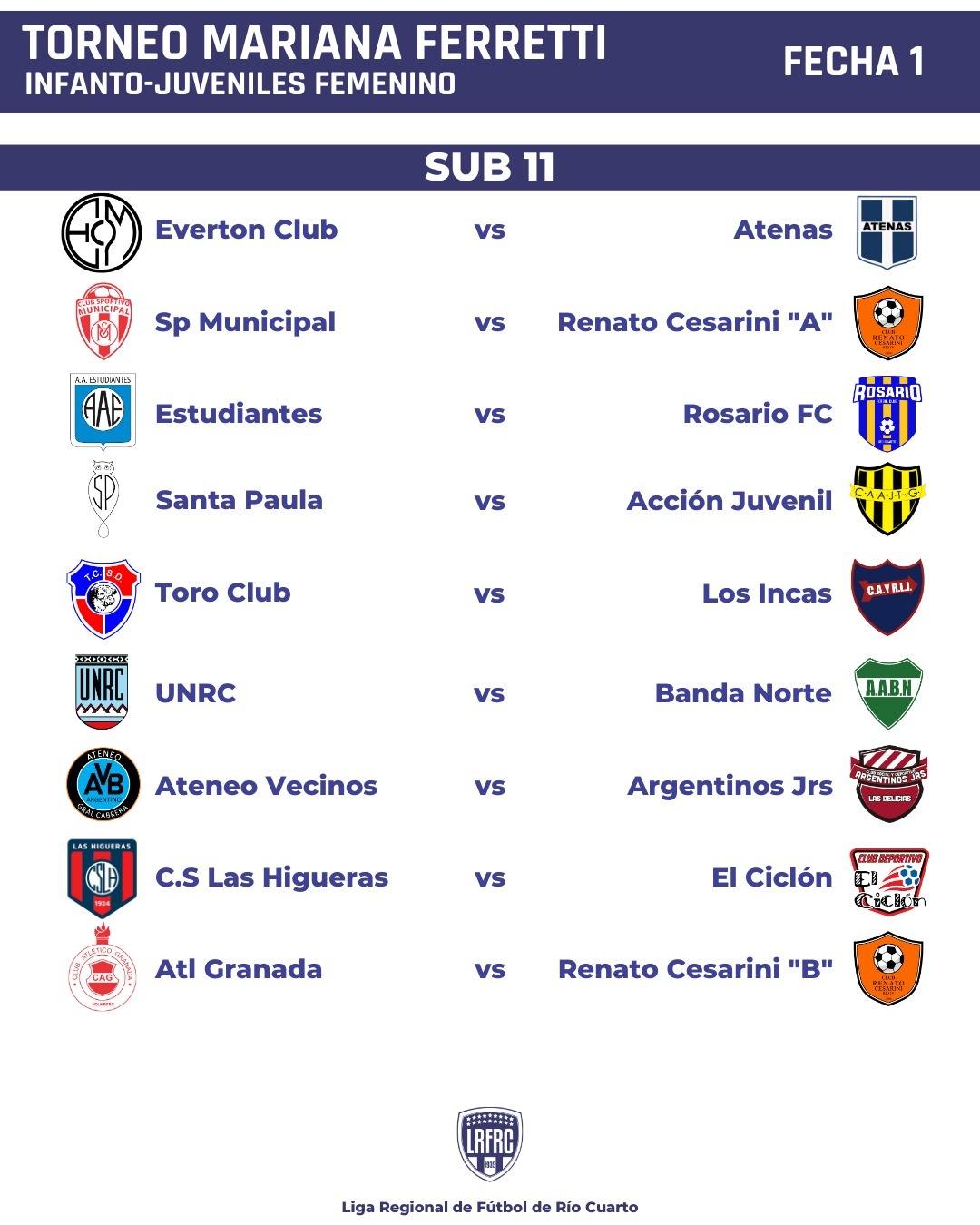 Atenas, Renato Cesarini, Rosario Fútbol Club, Santa Paula, Toro Club, Universidad Nacional de Río Cuarto, Ateneo Vecinos, Acción Juvenil, Sportivo Municipal, Estudiantes de Río Cuarto, Los Incas, Banda Norte, Argentinos Juniors de Las Delicias, Centro Social Las Higueras y El Ciclón participarán de la temporada 2023 que tendrá un torneo bajo la denominación de “Mariana Ferretti” referente del futbol femenino regional.
