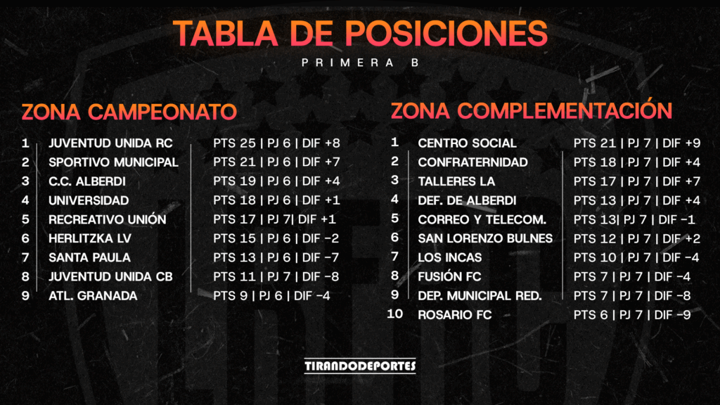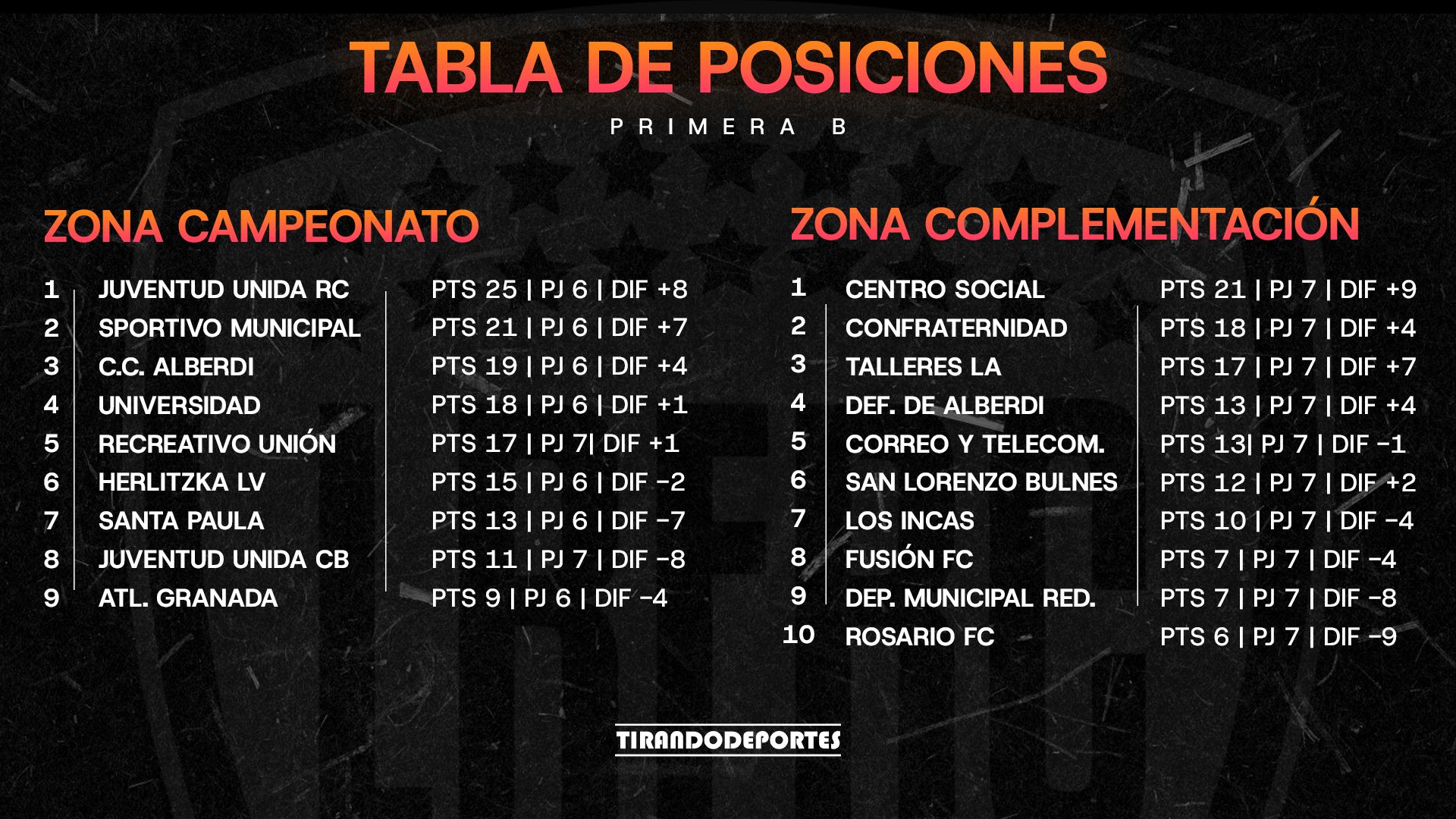 La lucha en ambas zonas se intensifica: en la Campeonato, Juventud Unida mantiene la cima pese a descansar, mientras que en la Complementación, Centro Social estira su ventaja y varios equipos se acercan a la pelea por el segundo puesto.
