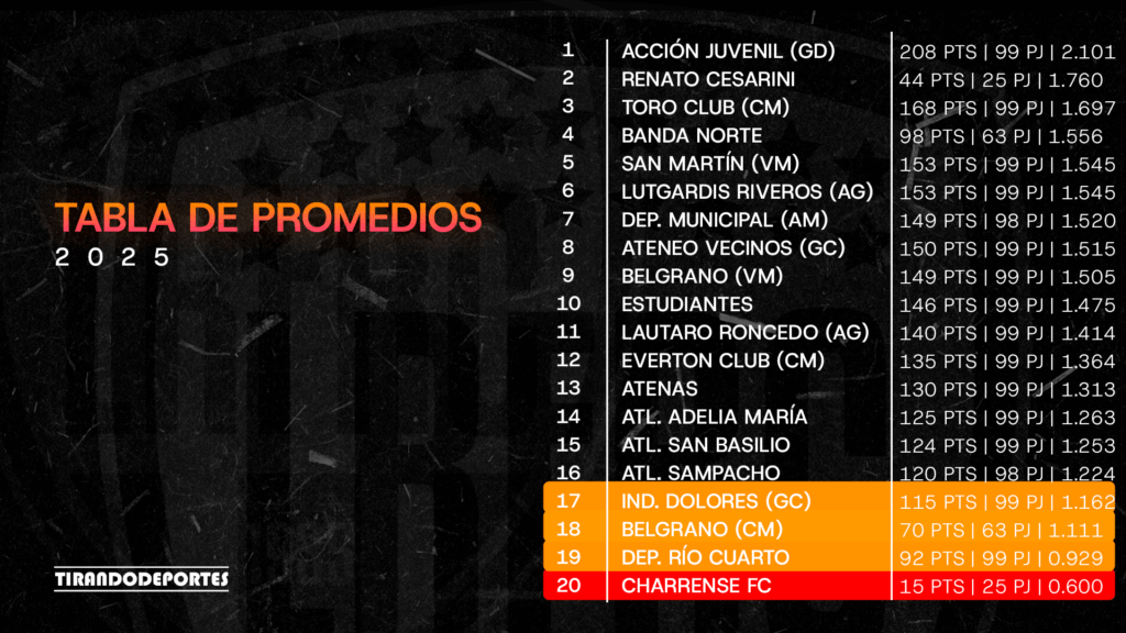 Hoy en el fondo aparece Charrense FC, con un promedio de 0.600 tras 25 partidos. El equipo de Carlos «Jote» Oyola necesita sumar fuerte en varias fechas para salvarse del descenso, luego de un mal comienzo de año. En el Apertura consiguió su primera victoria recién en la fecha 16. En este Clausura, en cambio, la alegría llegó rápido con un triunfo en la primera jornada nada menos que ante Acción Juvenil.