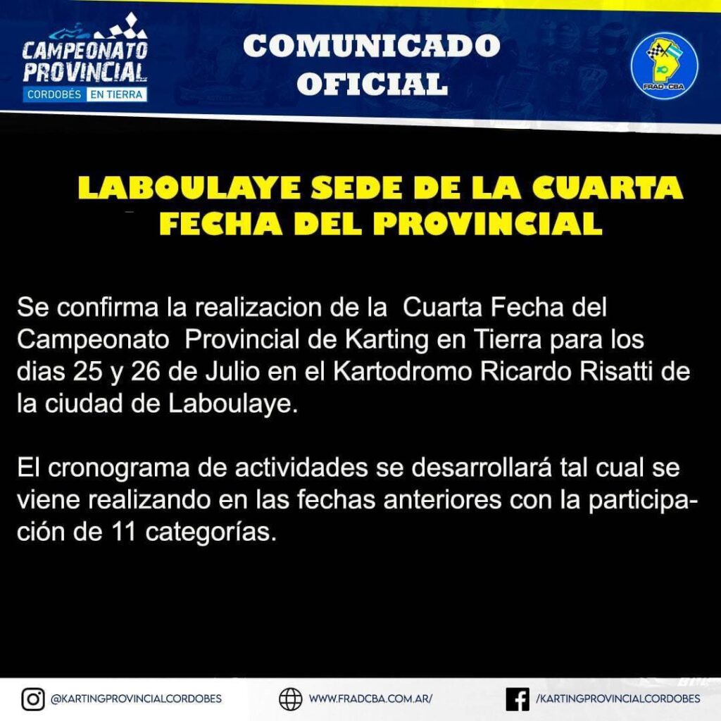 La cuarta fecha de los torneos de las diferentes divisiones de Karting sobre tierra comenzarán el 25 y 26 de Julio.