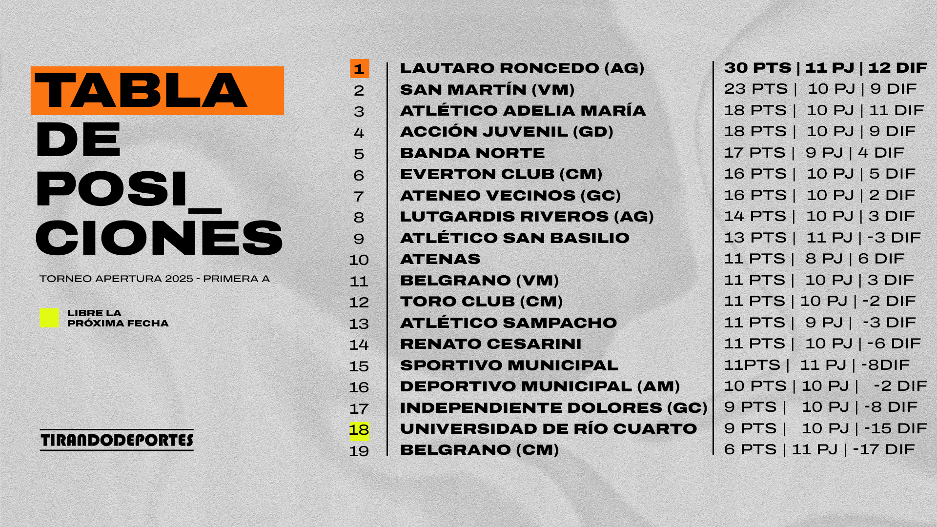 En su visita al Campus Universitario, el líder Lautaro Roncedo consolida su marcha casi perfecta y acumuló su decima victoria consecutiva en este Apertura al vencer 2-0 a Universidad con tanto de Ignacio Robledo en contra y Marcelo Ibañez sobre el cierre del encuentro, solo cayó ante Banda Norte en la jornada inaugural. Es puntero en soledad con 30 unidades.