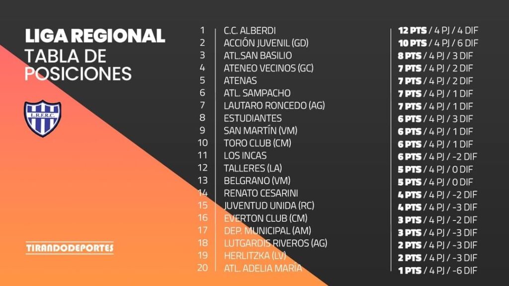 La victoria de Alberdi lo deja una fecha más en la cúspide de la tabla del Apertura, en la cual comienza a acomodarse y a esperar que en las próximas fechas la distancia sea mas grande para transitar con más tranquilidad el campeonato. Un escalón más abajo y a dos puntos de diferencia se encuentra un «airoso» Acción Juvenil, que de no ser por el empate contra Atlético San Basilio en el estreno del Apertura, compartiría el liderato con los riocuartenses ya que también sumó de a tres el fin de semana tras ganar 2-0 contra Lautaro Roncedo.