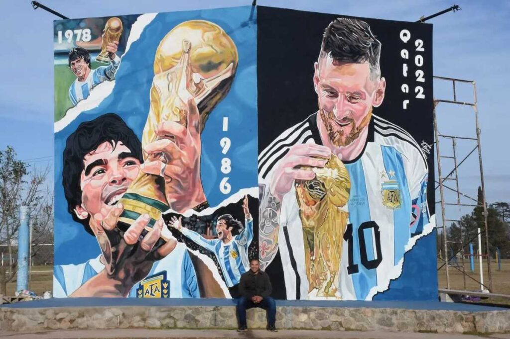 Luego comenzó a ejecutar su original diseño realista de posters arrancados con las figuras mundialistas, destacando a Maradona del ’86 y Messi del 2022 con sus copas; y ubicando a Kempes y Passarella del ’78 en los vértices. Utilizó esmaltes al agua en su mayoría y acrílicos.