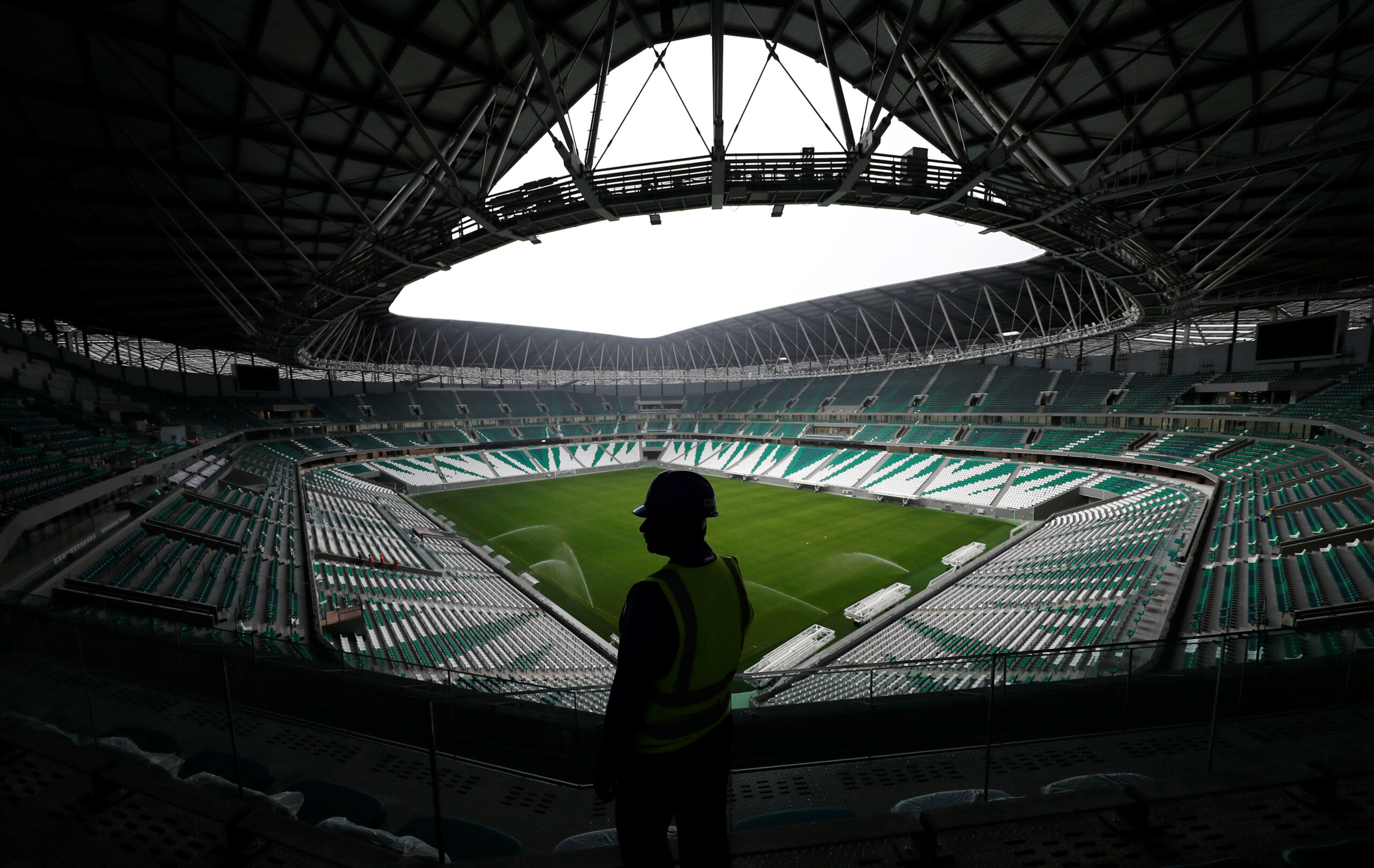 A worker is seen inside the Education City Stadium built for the upcoming 2022 FIFA World Cup soccer championship during a stadium tour in Doha, Qatar, December 15, 2019. REUTERS/Kai Pfaffenbach