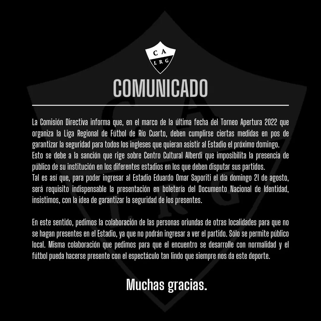 La condición para poder ingresar a la cancha será llevando el Documento Nacional de Identidad que avale la residencia de la localidad de Alcira Gigena.