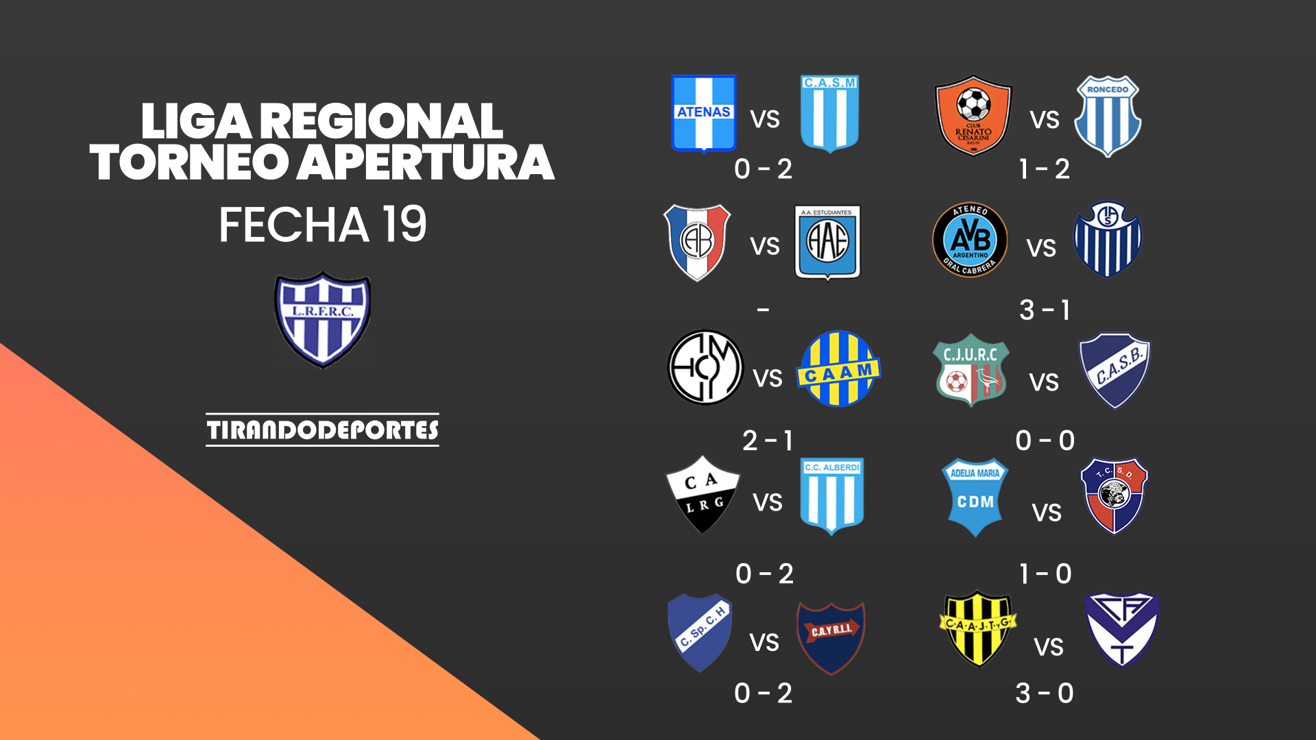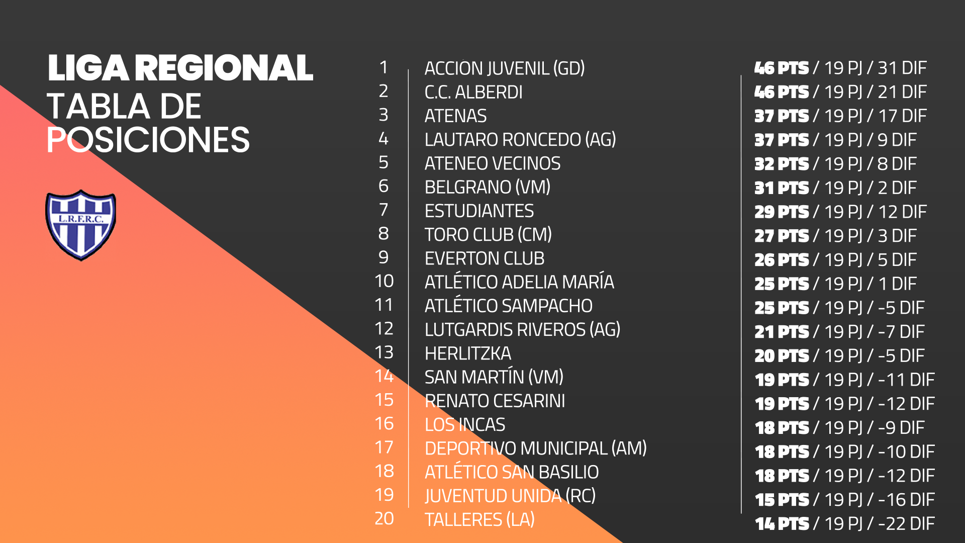 El cuadro muestra que si bien los de arriba siguen en su pelea, Roncedo será el equipo que integra el podio, en un proceso muy bueno para el equipo de Gigena que apuntará en el Clausura a lo más alto. Por su parte, Atenas comparte el tercer puesto tras ser derrotado por San Martín de Mackenna.