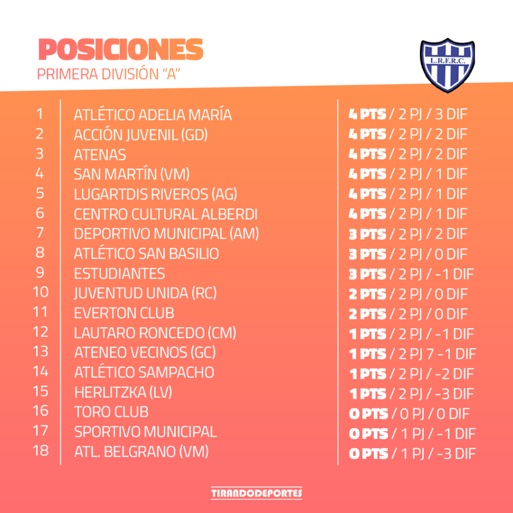 Luego de desarrollarse la segunda fecha de la Liga Regional en la Primera División A, seis son los equipos que acumulan cuatro unidades y mandan.