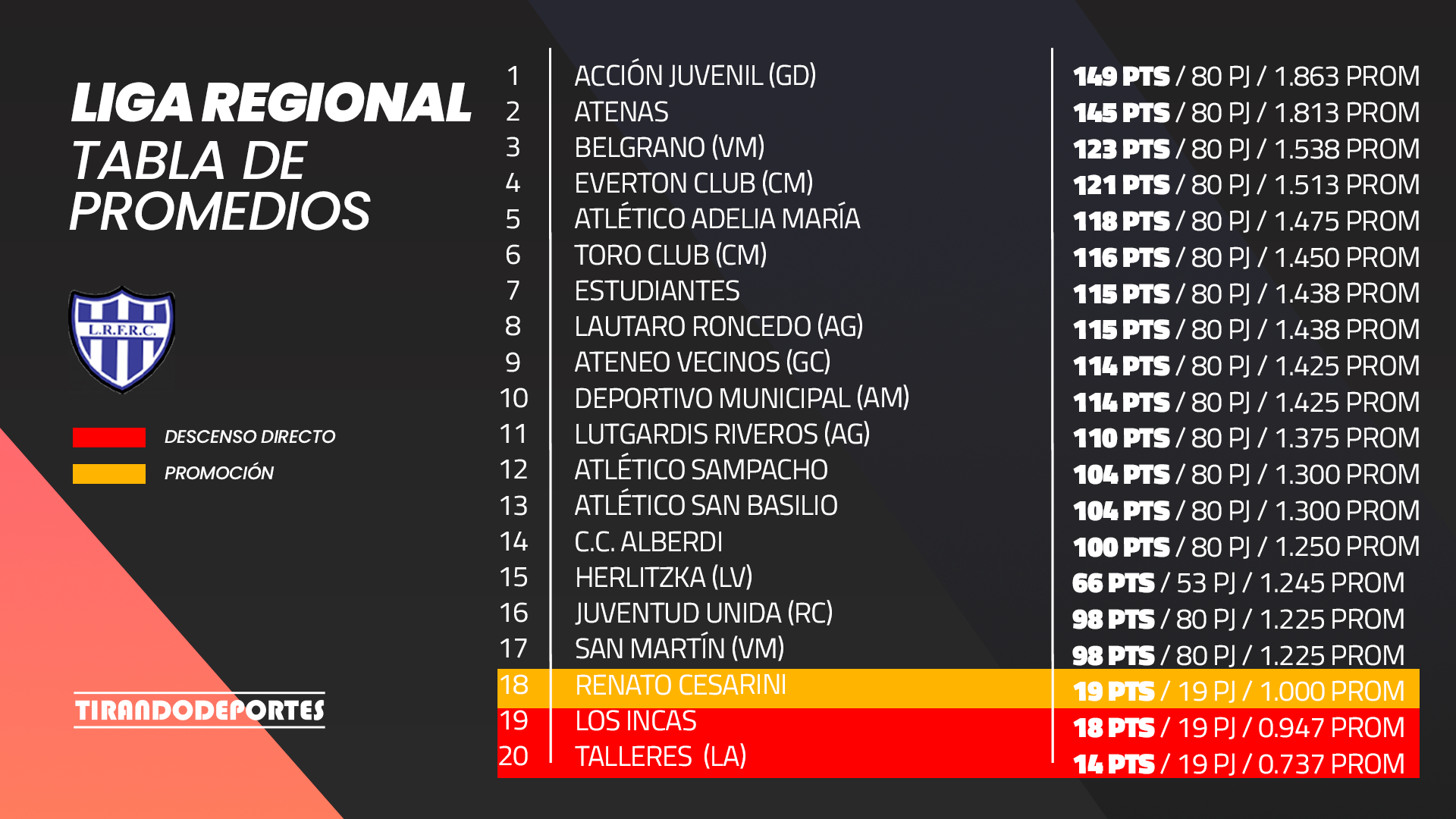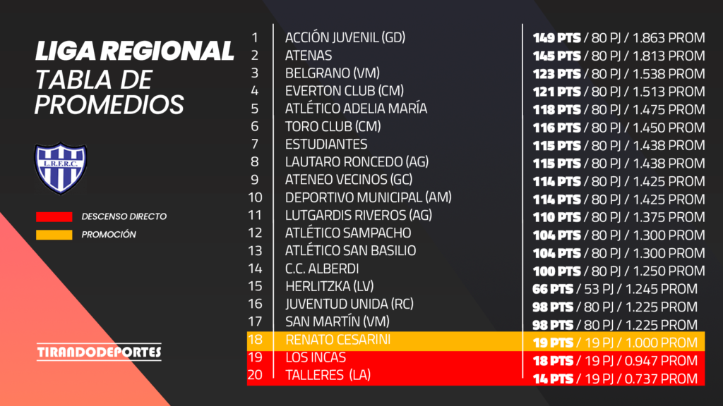 La campaña realizada por algunos conjuntos en el pasado campeonato tuvo repercusiones positivas y negativas en la tabla de promedios. En la que hoy por hoy, Renato Cesarini; Los Incas y Talleres de Acequias son los que están en la zona complicada.